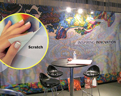La matière à sractch est appelée Graph'It®. Ce système breveté et exclusif d’affichage sans colle se compose d’une toile dont le dos est constitué de boules de « scratch » qui adhèrent directement au Velcro® fixé sur le support que vous souhaitez.