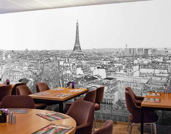En plus de décorer, le papier peint cachera les éléments de structure du lieu d'exposition.