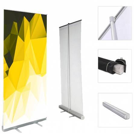 Browse through our selection of banner stands for our retractable prints. A banner made for transporting or conserving your custom prints designs for future use. Our Standard Retractable Banners are an efficient way to set up your banner without worrying about wall mountings or suspensions. Simply pull the banner from the stand and after each use, tug slightly to have it retract back inside. The stand material is very dependable and resistant to moisture, preventing the product from rusting. The fabric is made of PVC Vinyl, a material that is also dependable for lasting long periods of time and withstands water, chemical rotting, shock, and abrasion.